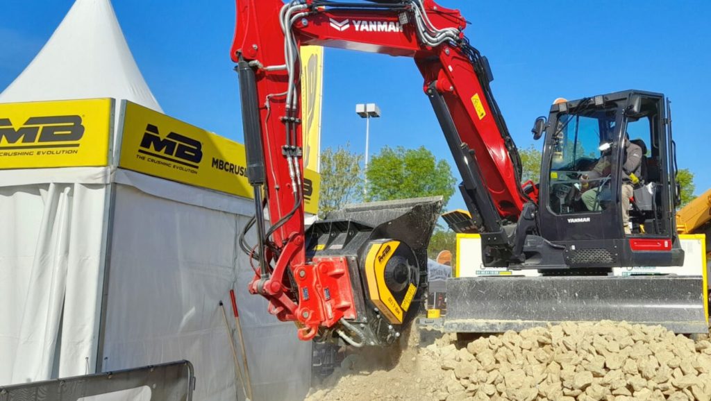 En la zona exterior, varios modelos de la gama compacta MB Crusher – una cuchara trituradora MB-L120, una cuchara seleccionadora MB-HDS312 y una pinza MB-G500– trabajaron instalados en una excavadora Yanmar SV100 con enganche rápido Lehnhoff.