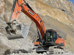 La excavadora DX420LC-5 Doosan para arrancar con martillo hidráulico la voladura de los barrancos frente a la cantera, y para poder voltear el material en camiones hasta la planta primaria.