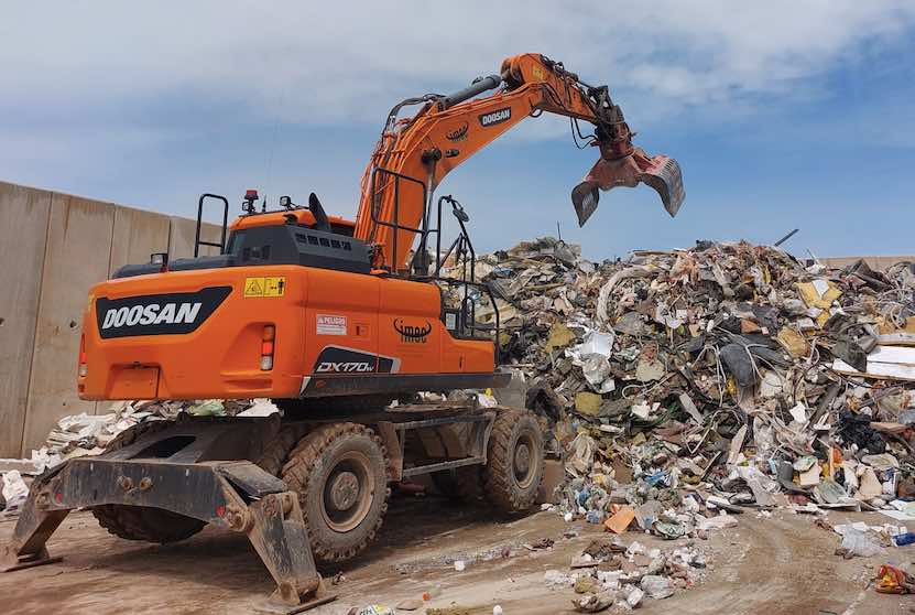 “Esta es idónea por su tamaño y su potencia. Le acoplamos una pinza para clasificar y separar diversos materiales en grupos. Además, de manipular en la zona de deshechos, la excavadora Doosan DX170W-5 arranca literalmente el plástico de las sacas big bag separando contenido de continente, lo que nos permite dividir y seleccionar de forma rápida y práctica rafia y tierra o escombro. Esta también efectúa el transporte y apila los contenedores que usamos.