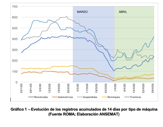 En el caso de máquinas remolcadas, automotrices y remolques, los acumulados a 14 días son ahora el doble de hace un mes, y aunque tienen camino aún para recorrer para recuperar el mercado de principios de marzo, la evolución indica que no tardarán en alcanzarlo.