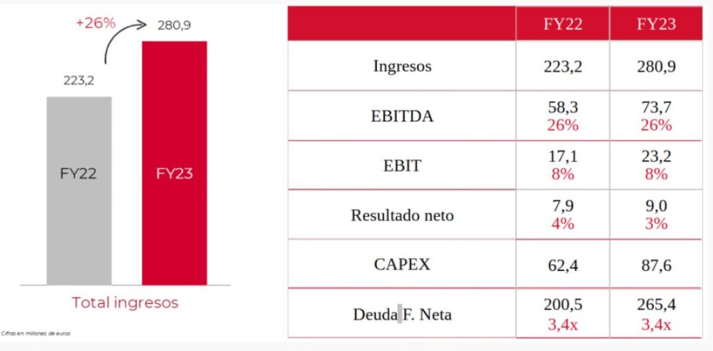 Este crecimiento excepcional se ve respaldado por una rentabilidad sólida, con un EBITDA de 73,7 millones de euros (un aumento del 26%) y un EBIT de 23,2 millones de euros (un incremento del 8%).