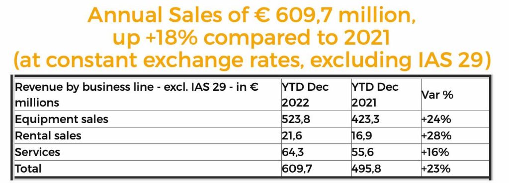 En 2022, las ventas de equipos aumentaron un +19% y la actividad de alquiler un +14%, impulsadas por el repunte de la actividad en Argentina. Las actividades de servicios, que alcanzaron su mayor nivel histórico, crecieron un +12%.