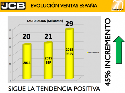 En cuanto a la cifra de ventas, a fecha 30 de septiembre JCB España alcanzaba una facturación de 21 millones de euros, con una previsión de 29 millones de euros para el cierre de 2015, lo que supone un incremento del 45% respecto al año pasado en el que la facturación fue de 20 millones de euros. El porcentaje por sectores se sitúa en torno al 70% para el área de construcción y un 30% en agricultura. El crecimiento de JCB se ha experimentado básicamente en el sector de la construcción y la obra pública, ya que el sector agrícola mantiene constantes las ventas de ejercicios anteriores.