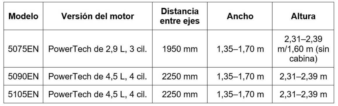 La nueva serie está compuesta por los modelos 5075EN, 5090EN y 5105EN, todos ellos concebidos para operar en espacios reducidos y bajo alturas limitadas. Con distancias entre ejes de 1,95 m o 2,25 m y anchos que varían entre 1,35 y 1,70 metros, el 5075EN destaca como la opción más adecuada para zonas especialmente estrechas.