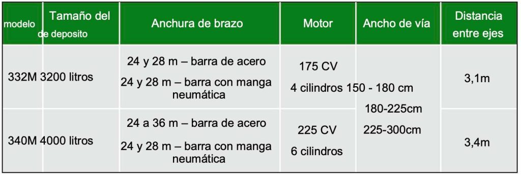 Con el 332M y el 340M, se introducen dos modelos en la serie. El 332M ofrece un tamaño de depósito de 3.200 litros y un motor de 175 CV y 4 cilindros John Deere. Una barra de pulverización con hasta 28 metros y un radio de giro de 3,8 metros son ideales para trabajar en zonas estrechas.