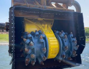 Los trabajos de alto rendimiento en condiciones sensibles se están completando gracias al uso adecuado de la fresadora de alta calidad ER 3000 de Epiroc equipada con un equipo adicional especial. No solo cuenta con una protección específica contra el desgaste para las cargas extremas bajo el agua, sino que, en una primera fase de trabajo, también dispone de una campana de aspiración instalada aparte alrededor de la fresa. Con esta técnica probada en numerosas ocasiones, los escombros generados durante las tareas de fresado se aspiran y transportan de forma controlada al pontón trasero. Ahí hay un complejo sistema de filtración y separación, así como un contenedor de carga para los escombros.