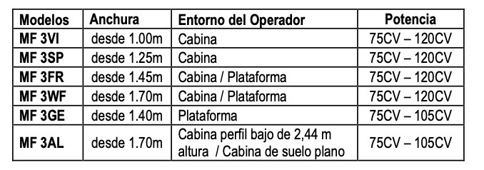 La serie MF 3 Especialista incluye seis versiones diferentes, con un nuevo modelo superior de 120 CV disponible para todas las versiones, excepto los modelos MF 3GE y MF 3AL. La gama completa ofrece modelos con cabina o plataforma, una opción de transmisiones que incluye una nueva opción de 30×15 con una velocidad de 40 km/h Eco, así como las opciones de especificación Essential o Efficient.