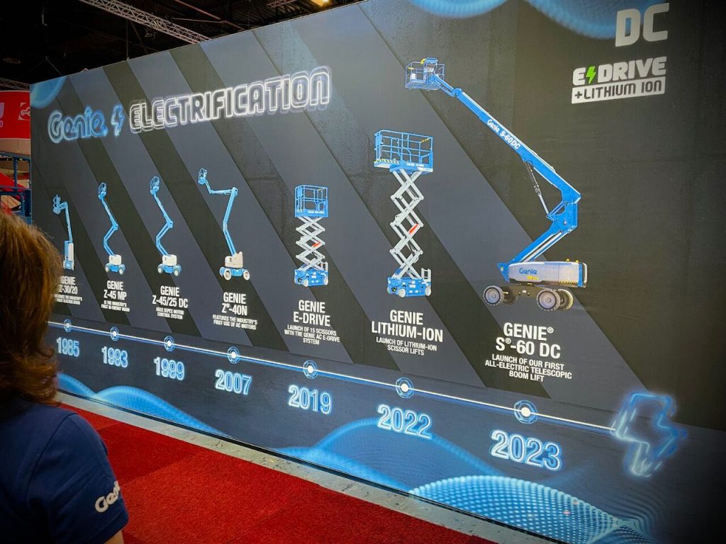 Hemos podido ver la plataforma Genie® S®-60 DC  eléctrica que ofrece el mismo rendimiento de una plataforma diésel 4×4 en una máquina eléctrica eco-responsable. Los motores eléctricos AC ultraeficientes permiten un rendimiento de un día completo con una sola carga de la batería, lo que la convierte en una solución ideal para una serie de aplicaciones en el interior y exterior, en obras, fábricas, centros comerciales, estadios deportivos y también zonas peatonales.