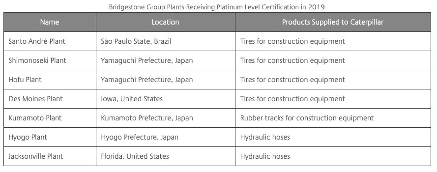 En 2019, un total de siete fábricas del Grupo Bridgestone recibieron la certificación Nivel Platino. De estas fábricas, la planta de Santo André (Bridgestone do Brasil Industria e Comercio Ltda.) Ha recibido esta certificación por ocho años consecutivos. La planta de Shimonoseki (Bridgestone Corporation) y la planta de Hyogo (Bridgestone Flowtech Corporation) han recibido esta certificación durante cinco años consecutivos. Además, la planta de Hofu (Bridgestone Corporation) y la planta de Des Moines (Bridgestone Americas Tire Operations, LLC) han recibido esta certificación por tres años consecutivos.