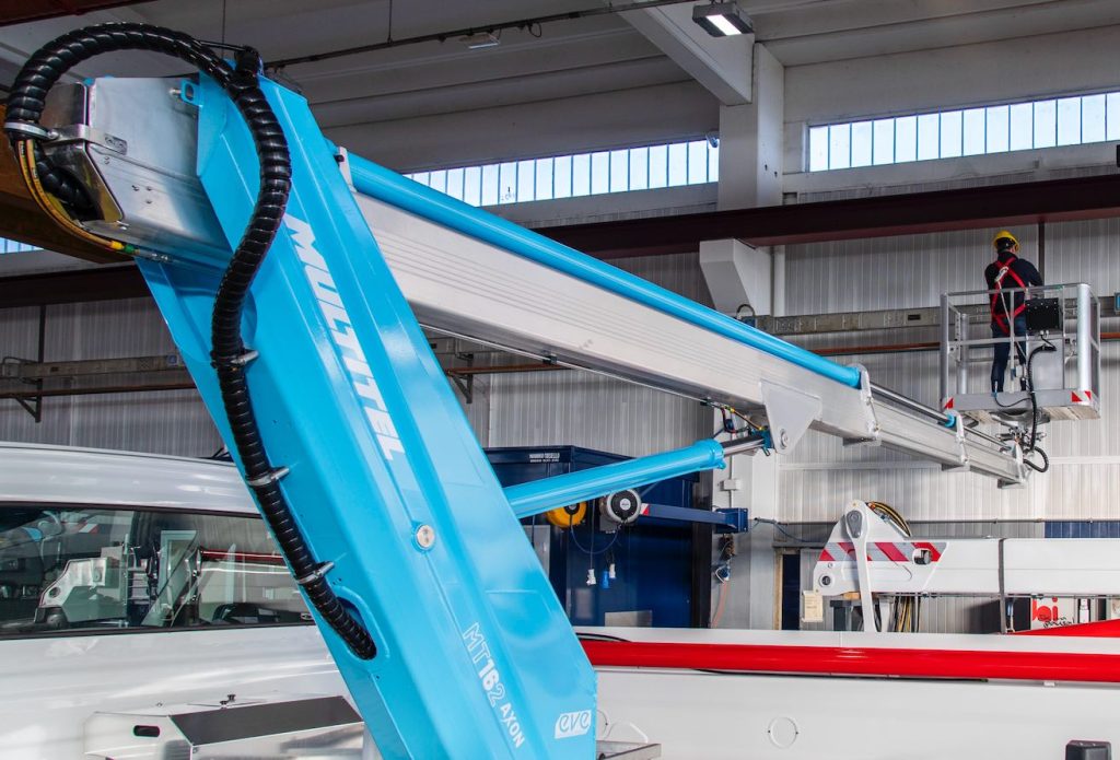 También veremos el modelo más conocido y popular de Multitel Pagliero, la plataforma telescópica 160 ALU R que se presenta con la ‘R’ (Restyling) de las iniciales, con algunas innovaciones en comparación con el modelo clásico. En primer lugar, la longitud, que se reduce en unos 10 cm y la hace aún más eficiente en áreas pequeñas. Una eficiencia a la que contribuye el nuevo sistema de estabilización rectilíneo frontal, en lugar del inclinado. También cambia la capacidad de la plataforma. Anteriormente 200 kg a 7.80 m de alcance; ahora 230 kg a 7.50 m de alcance. La altura de trabajo permanece sin cambios: 16.50 metros.