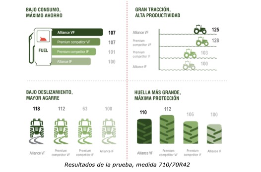 IRSTEA realizó cuatro pruebas de campo sobre los siguientes aspectos: eficiencia de combustible, tracción, deslizamiento en suelos blandos y amplitud de la pisada. Se realizaron pruebas de neumáticos Alliance 372 VF y de flexión mejorada (IF) para compararlos con 2 modelos similares IF y VF de fabricantes premium, en las mismas medidas: 600/70R30 para la parte delantera y 710/70R42 (neumáticos traseros). La presión de inflado del neumático se mantuvo constante a 1,6 bares para los neumáticos delanteros, mientras que la carga variaba entre 4375 daN (IF) y 5150 daN (VF). Para los neumáticos traseros, la carga se mantuvo constante en 4875 daN, mientras que la presión de inflado variaba entre 1 bar (IF) y 0,8 bares (VF). Para la interpretación de los resultados, se utilizó el rendimiento del neumático IF de Alliance como valor inicial de referencia o 100 %.