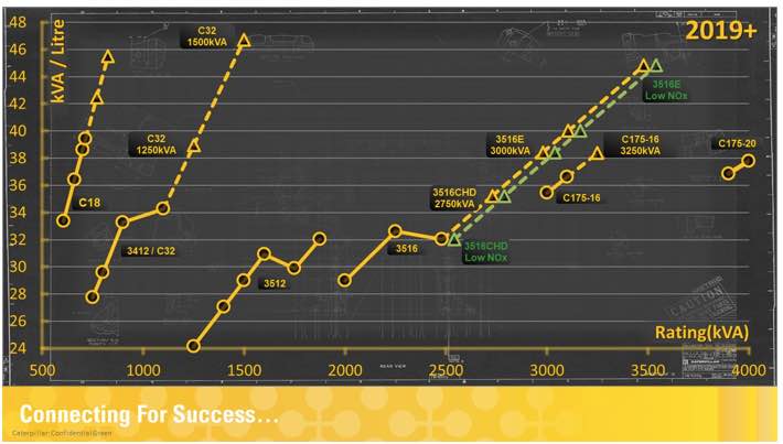 El desarrollo técnico de los motores de combustión Diésel ha permitido al fabricante Caterpillar suministrar grupos electrógenos con densidades de potencia hasta ahora nunca vistas. Si hace 20 años se manejaban densidades de potencia de 35 kVA por litro, ahora se superan los 45 kVA por litro.