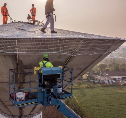 El supervisor Renato Poloni comenta: «Tuvimos que empezar con el diseño tanto del método de aseguramiento del «sombrero» como, en colaboración con los técnicos de Elevo, del posicionamiento planialtimétrico de la cesta, prestando mucha atención a todos los aspectos de seguridad, como la accesibilidad al lugar de trabajo, las líneas eléctricas suspendidas, los impedimentos geométricos adyacentes, la capacidad de carga del terreno, las instalaciones subterráneas, etc., etc.».