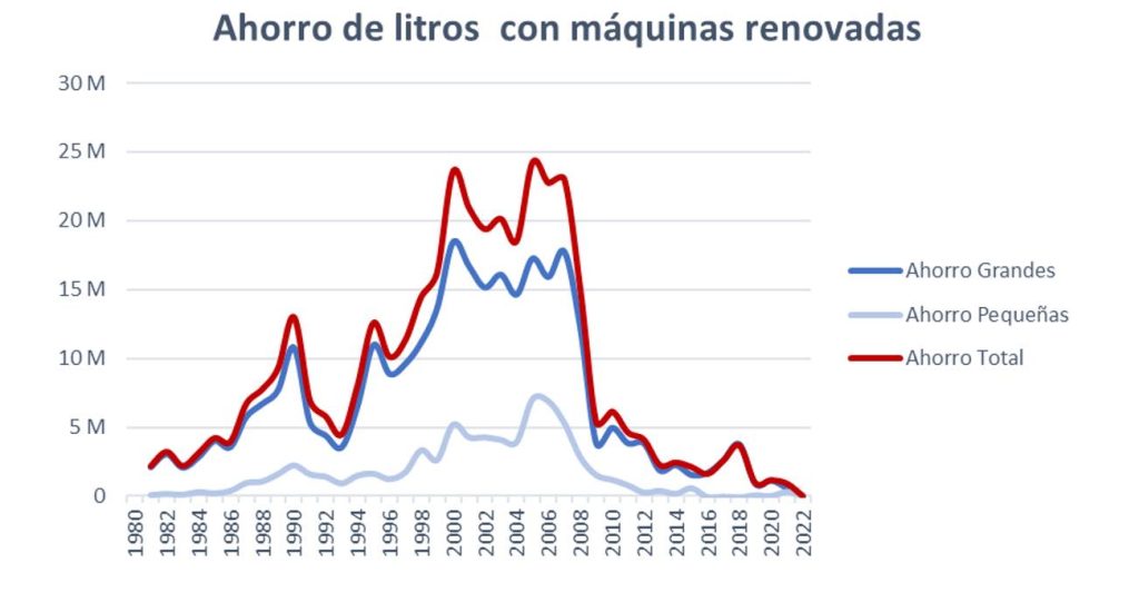 En el caso de las máquinas fabricadas antes de 1999 (15.858 unidades), la sustitución por unidades nuevas supondría un ahorro global en el consumo anual de combustible de 20 millones de litros en el caso de máquinas pequeñas y de 109 millones de litros en máquinas grandes.