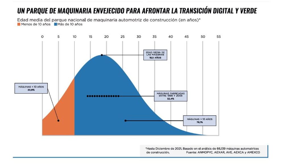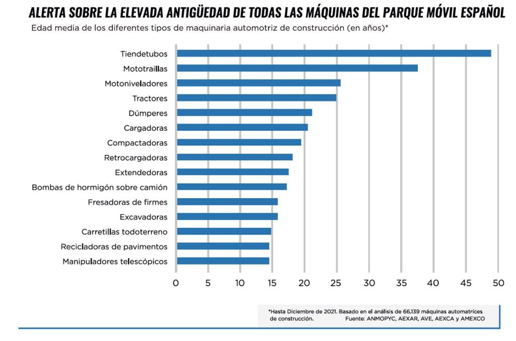 Según el estudio realizado recientemente por la Asociación Española de Fabricantes de Maquinaria para Construcción y Minería (ANMOPYC) con la colaboración de la Confederación Nacional de la Construcción y algunas asociaciones regionales de excavadores, en el que se han analizado más de 66.000 máquinas automotrices, se concluye que el 79,1 % de estas máquinas tienen más de 10 años y que la edad media del parque de maquinaria de construcción autopropulsada se sitúa en los 18,5 años.