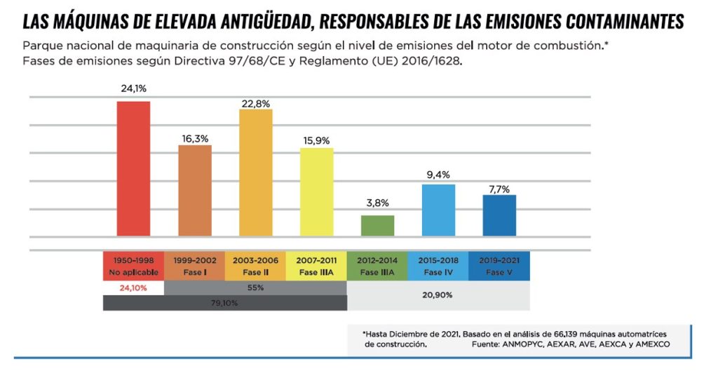 La maquinaria de más de 10 años de edad supone el 79,1% del total del parque en uso en España. Una máquina fabricada en el año 2022 contamina de media 20 veces menos que una máquina fabricada en el año.